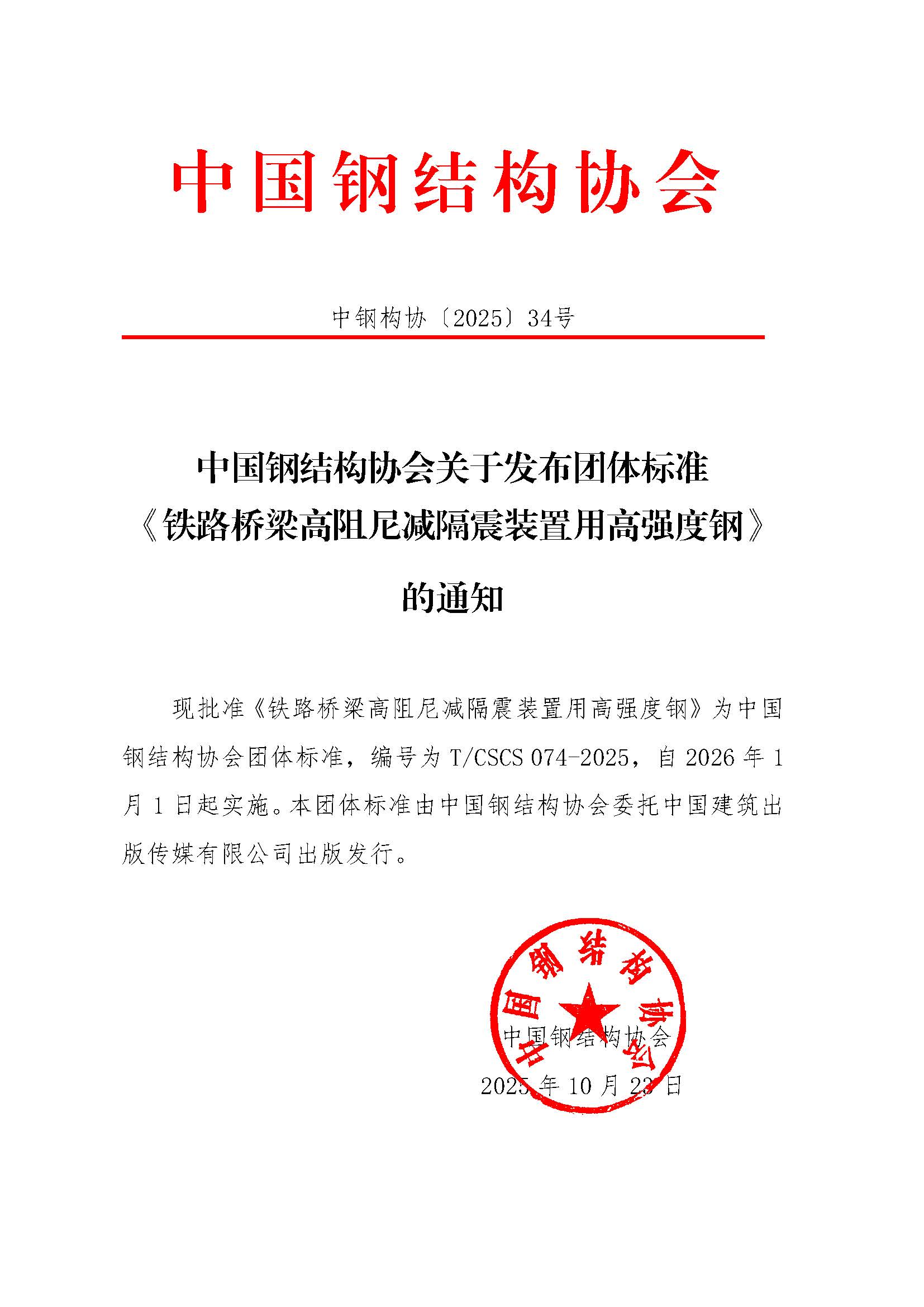 中國鋼結構協會關于發布團體標準《鐵路橋梁高阻尼減隔震裝置用高強度鋼》的通知